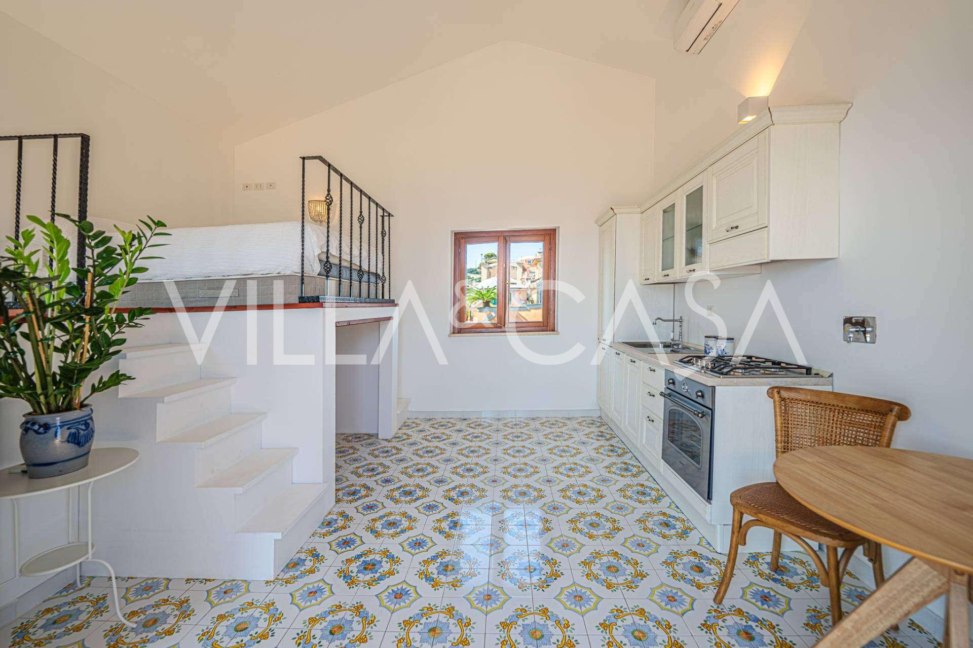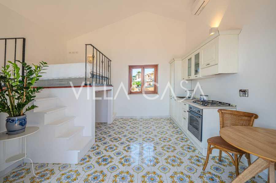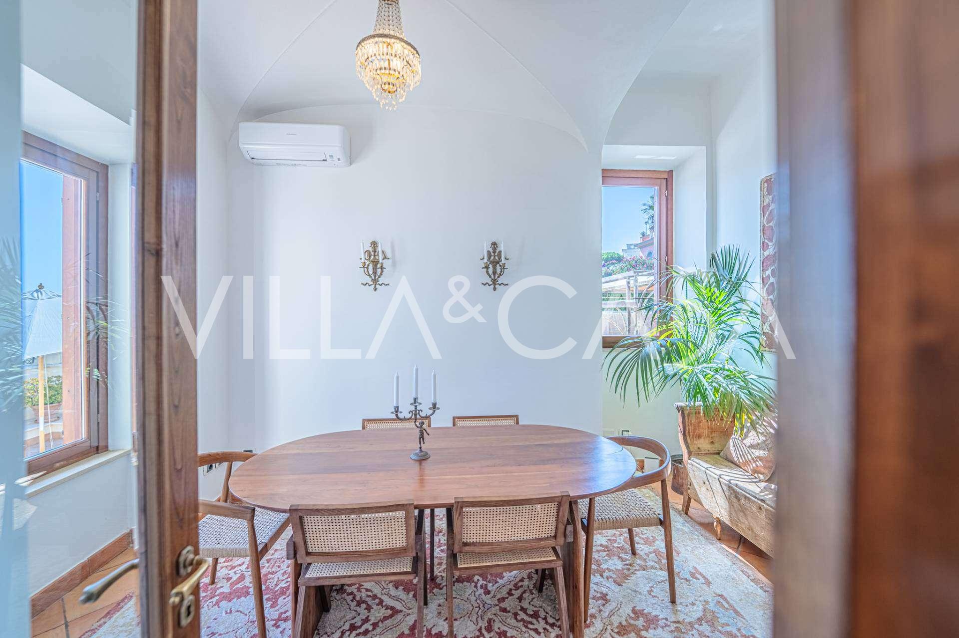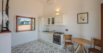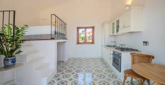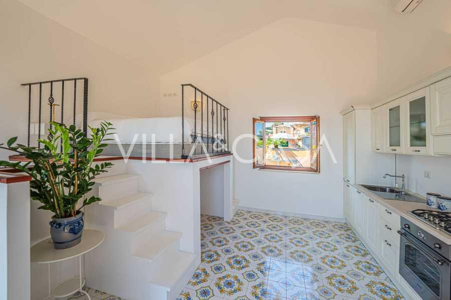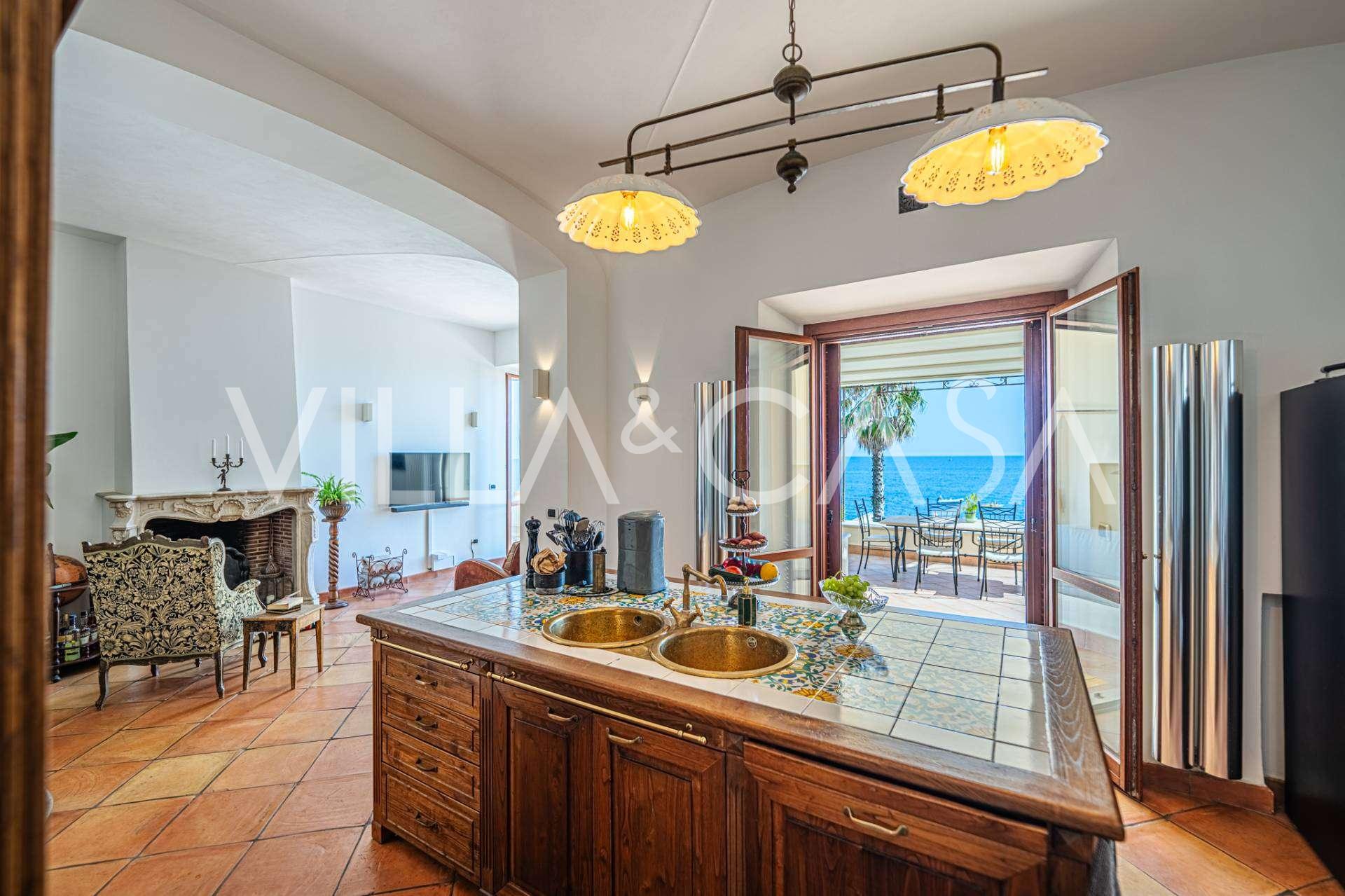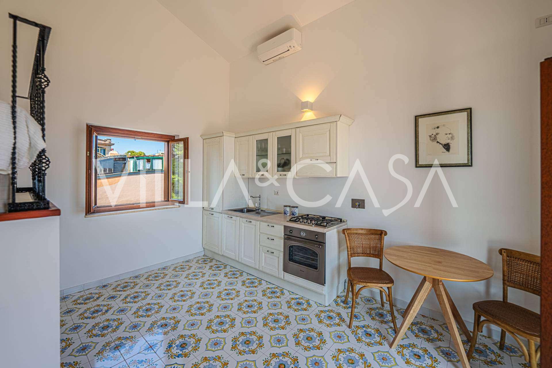 Galvenā viesistaba, rotāta ar lieliem logiem, iziet uz terasi, kas ir ideāli piemērota saziņai un retu saulrietu baudīšanai. Virtuve, izgatavota pēc individuāla pasūtījuma, apvieno estētiku un funkcionalitāti, ar salu, kas dekorēta ar Positano flīzēm, un oriģināliem vara izlietnēm.